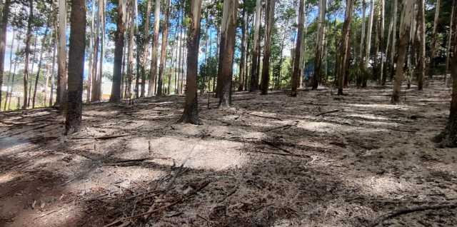 Bombeiros controlam incêndio em vegetação rasteira junto a plantação de eucaliptos