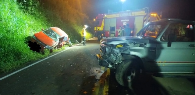 A guarnição foi acionada por volta das 20h13 para atender a uma colisão frontal, com impacto também lateral, envolvendo um Fiat Palio e uma Chevrolet D20.