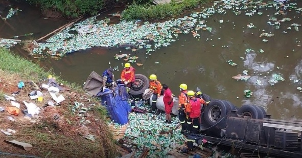 Com o impacto, o motorista, de 34 anos, ficou preso às ferragens da cabine e morreu ainda no local. A carga, composta por cervejas da marca Heineken, foi completamente danificada, com parte do material espalhado e outra parte derramada dentro do rio.