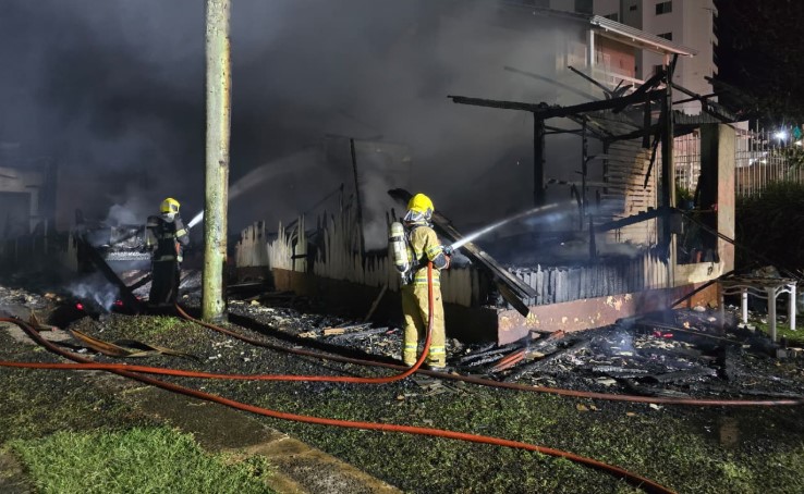 As chamas já estavam em desenvolvimento completo quando o Corpo de Bombeiros chegou ao local. Como havia uma casa muito próxima e não era possível acessar imediatamente o imóvel atingido, a equipe iniciou o combate de forma defensiva, priorizando evitar que o fogo se espalhasse para a residência vizinha.