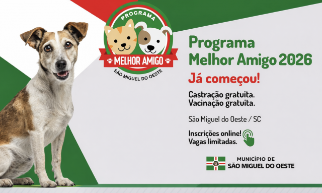 A Prefeitura de São Miguel do Oeste deu início ao Programa Melhor Amigo 2026, iniciativa voltada ao cuidado, proteção e bem-estar dos animais no município. O programa oferece castração e vacinação gratuitas para tutores de baixa renda, contribuindo diretamente para a saúde animal e para a qualidade de vida da população.