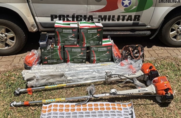 Diante da situação, os policiais se deslocaram até a residência do suspeito, localizada no município de São José do Cedro. No local, foram encontradas mais cinco roçadeiras novas, além de uma sacola contendo diversos adesivos de diferentes marcas, o que confirmou a prática de falsificação dos produtos.