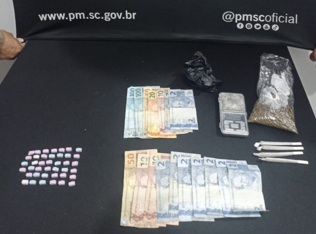 Diante da situação de flagrante, os policiais se deslocaram até a residência do suspeito, localizada no bairro São Luiz. No local, foram abordados um adolescente de 17 anos e uma mulher de 29 anos. Em buscas no imóvel, os policiais localizaram mais 37 comprimidos de ecstasy, uma balança de precisão, 50 gramas de maconha, quatro cigarros de maconha produzidos artesanalmente, 26 gramas de cocaína e dinheiro em notas trocadas, característico do comércio de entorpecentes.