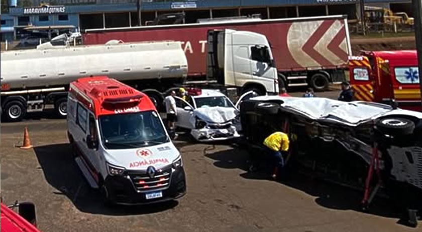 No veículo lateralizado, havia uma vítima em encarceramento mecânico, em pé no compartimento. Após estabilização da van, foi realizada abertura da porta e o condutor saiu por meios próprios.
